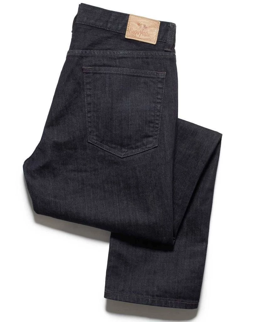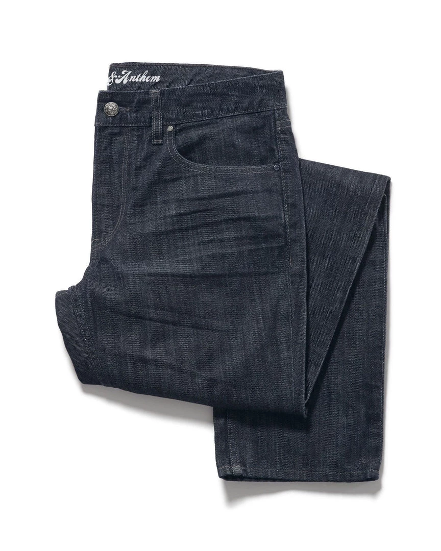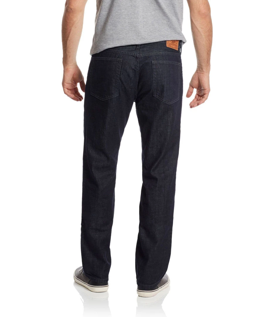 Straight fit. Extremely soft cotton stretch fabric. Dark wash. Leather logo back patch, logo button, zipper fly, and contrast stripe interior pockets. Traditional 5-pocket styling. Regular rise, straight through hip and thigh. Dark wash.Â