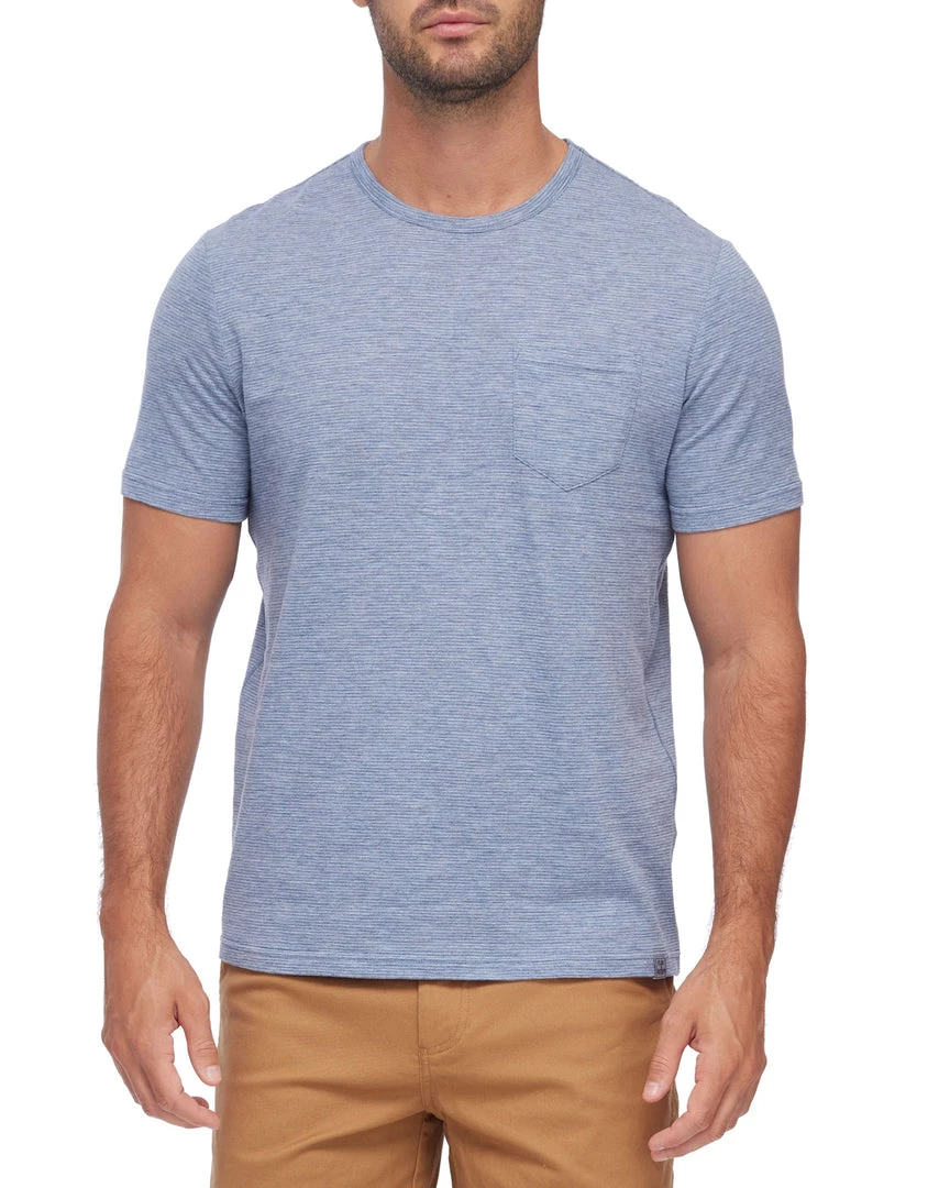 Supremely soft and ultra-comfortable, this short-sleeve crewneck tee is a wardrobe essential. Made from a lightweight slub cotton-blend fabric in a tailored athletic fit, our Biscoe Striped Crewneck Tee delivers casual style every day. Patch pocket on wearer’s left chest; tagless neck label; woven Flag & Anthem jock tag.