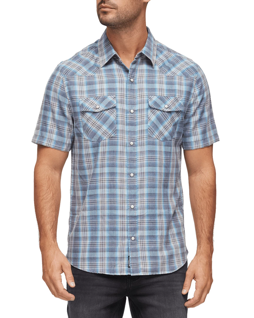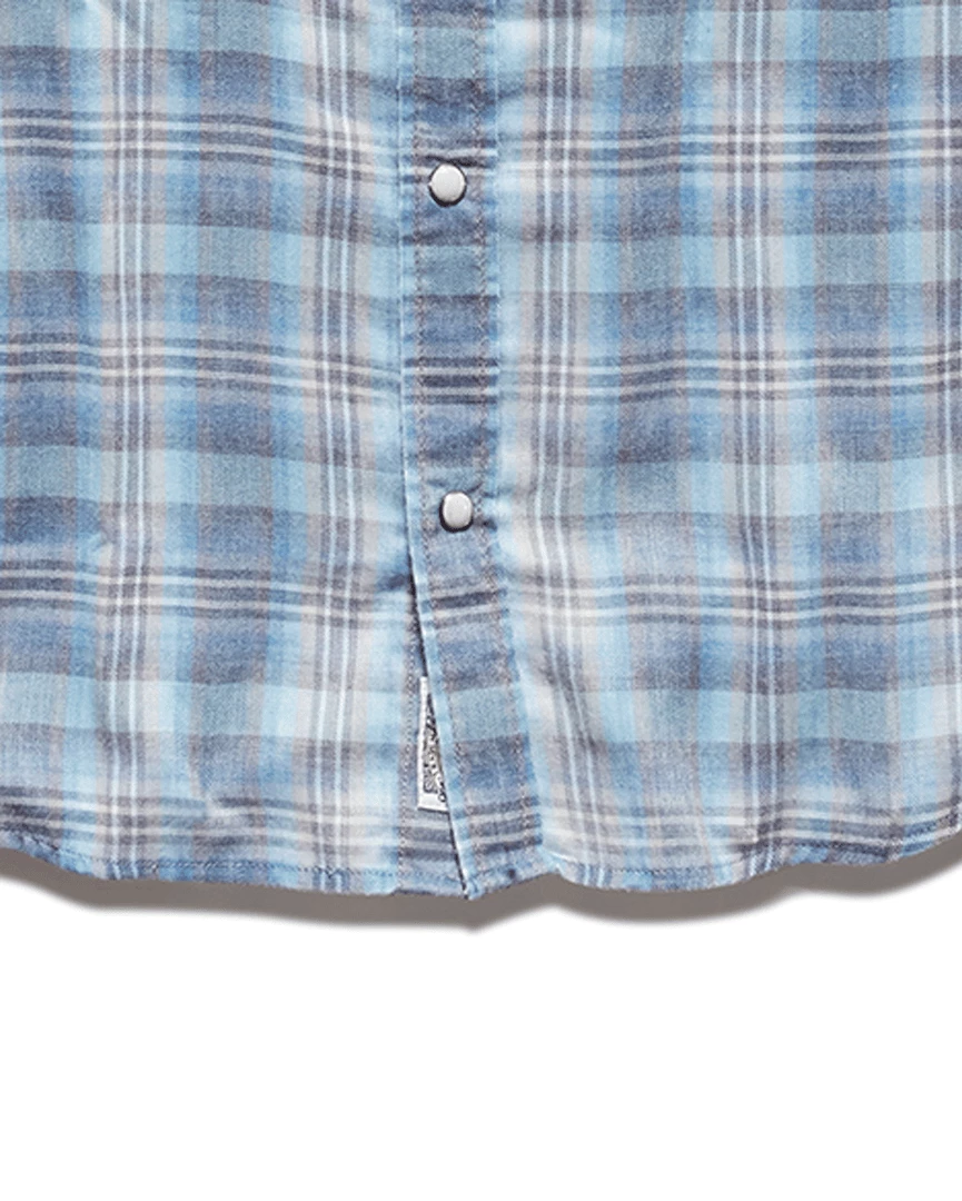 Made from an insanely soft and comfortable, lightweight cotton blend burnout fabric detailed with a timeless plaid print, this short-sleeve Western shirt offers an authentic, vintage-inspired look tailored to perfection. Contrast chambray fabric inside collar stand, back yoke, and sleeve cuffs. Dual front flap pockets; snap closures. Tailored athletic fit.