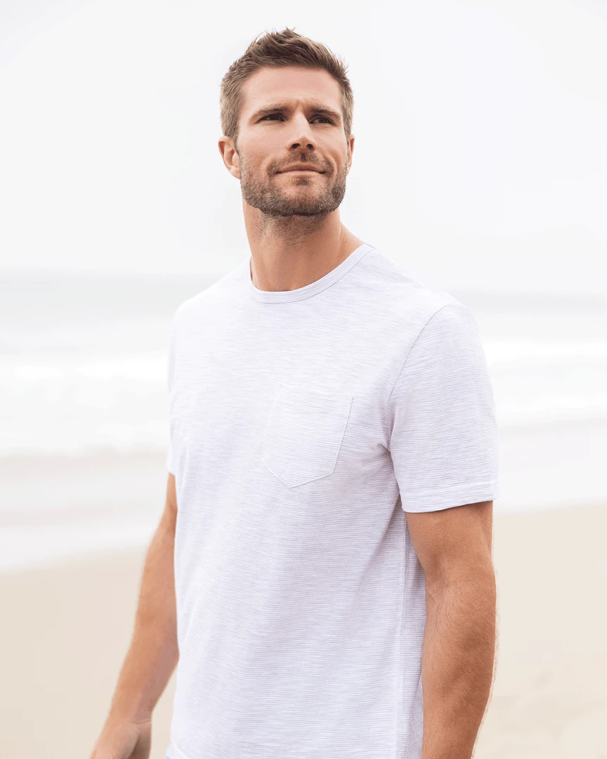 Who couldn’t use an extra pocket? This super-soft crew is the way to go. Made from an ultra-comfortable and breathable lightweight pure cotton in a tailored athletic fit, our Davin Slub Crewneck Tee won’t weigh you down. Patch pocket on wearer’s left chest; tagless neck label; woven Flag & Anthem jock tag.