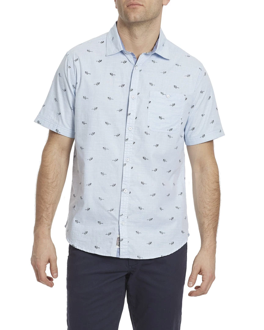 An easygoing warm-weather staple made from premium lightweight cotton with an all-over mini sunglass print, this short-sleeve button-front shirt underscores your casual look. Contrast chambray fabric in collar and cuffs. Single front chest pocket; button closures.