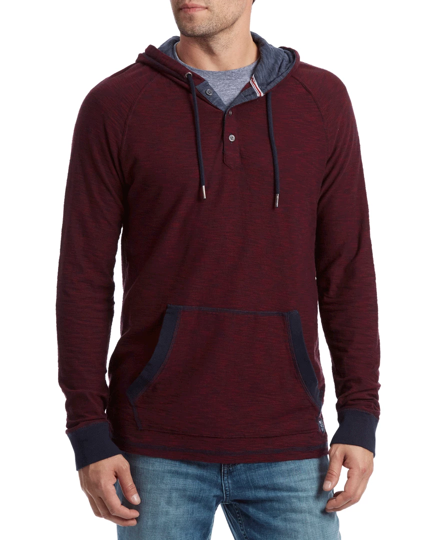 A classic pullover hoodie gets a boost of versatility with a three-button front placket and tailored athletic fit, making for easier wear and a more sophisticated style. Kangaroo pocket. Woven Flag & Anthem jock tag.