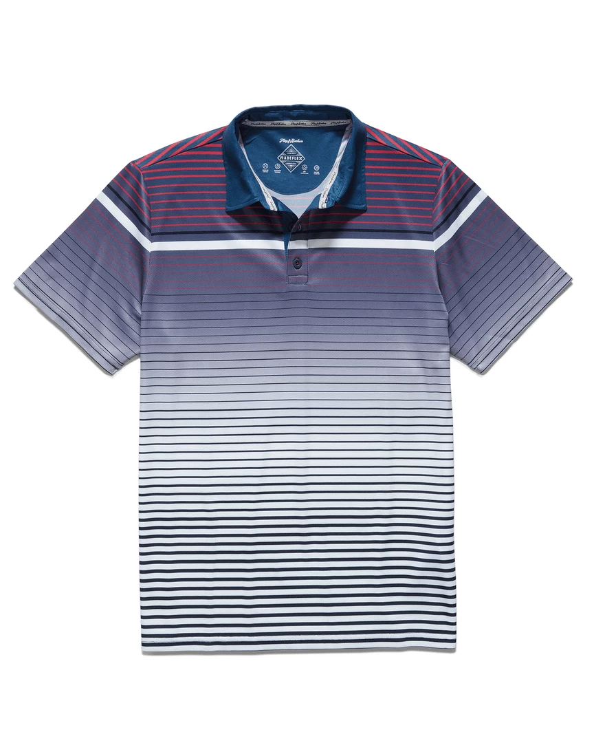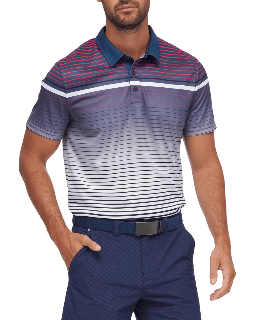 This striped performance polo is designed to deliver unrivaled comfort in a versatile style that seamlessly transitions off course. Constructed from tour-quality performance fabric that features moisture-wicking technology, four-way stretch, plus easy-care benefits. UPF sun protection provides added comfort and coverage. Traditional three-button front placket; rubberized MadeFlex performance patch logo at center back neck. Tailored athletic fit.