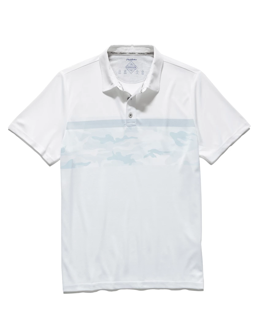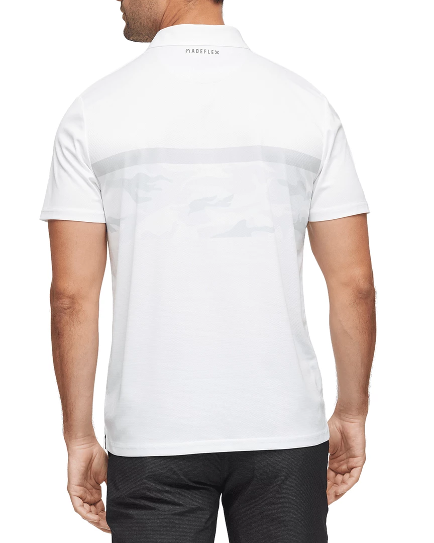 Made for the links. Ready for anything. This camo print polo packs all the performance punch for your favorite golf polo into a versatile style that you can wear anywhere. Made from a lightweight and breathable jersey fabric that delivers moisture-wicking technology, UPF sun protection, and easy care benefits plus four-way stretch for optimal mobility during your next round. Traditional three-button front placket; rubberized MadeFlex performance patch logo at center back neck. Tailored athletic fit.