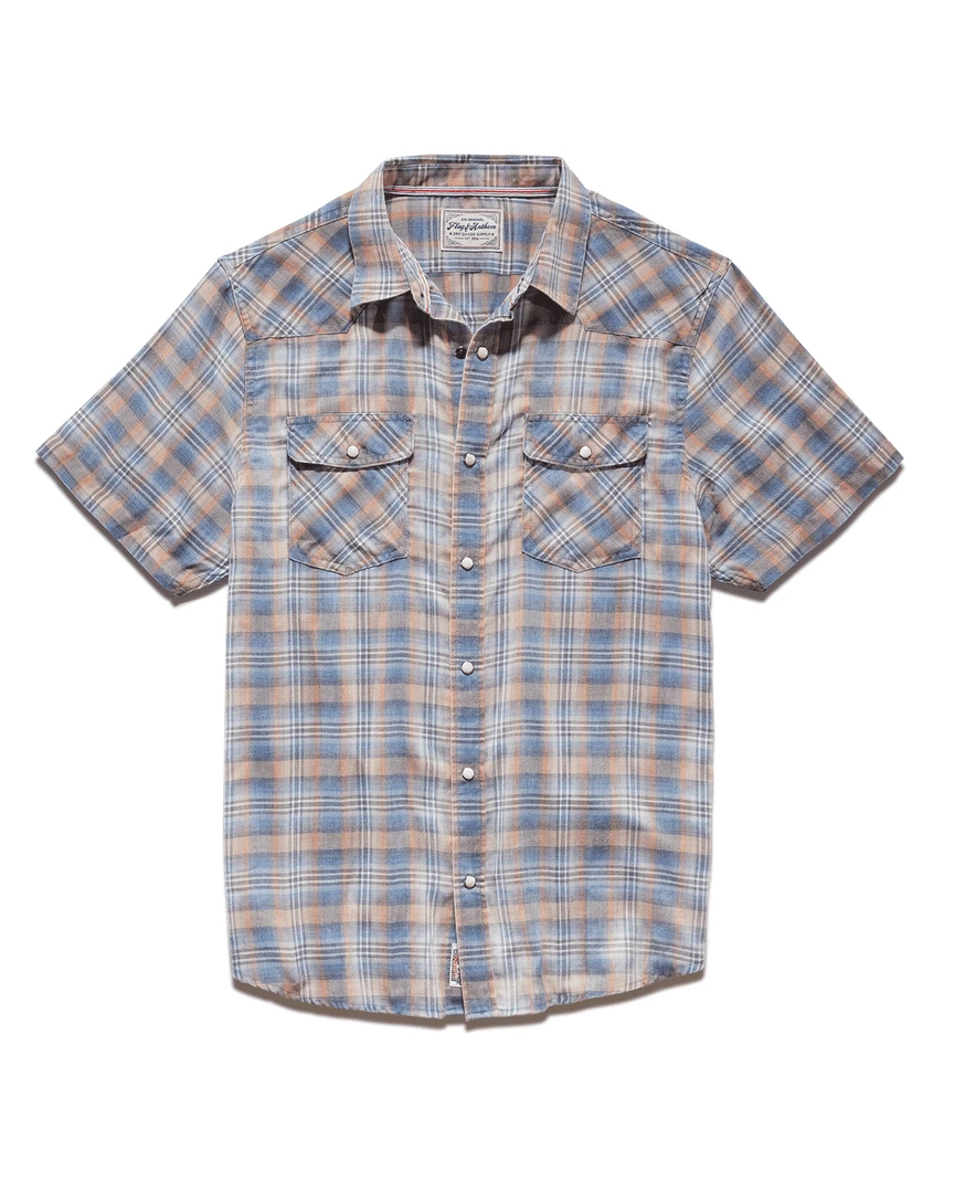 Made from an insanely soft and comfortable, lightweight cotton blend burnout fabric detailed with a timeless plaid print, this short-sleeve Western shirt offers an authentic, vintage-inspired look tailored to perfection. Contrast chambray fabric inside collar stand, back yoke, and sleeve cuffs. Dual front flap pockets; snap closures. Tailored athletic fit.