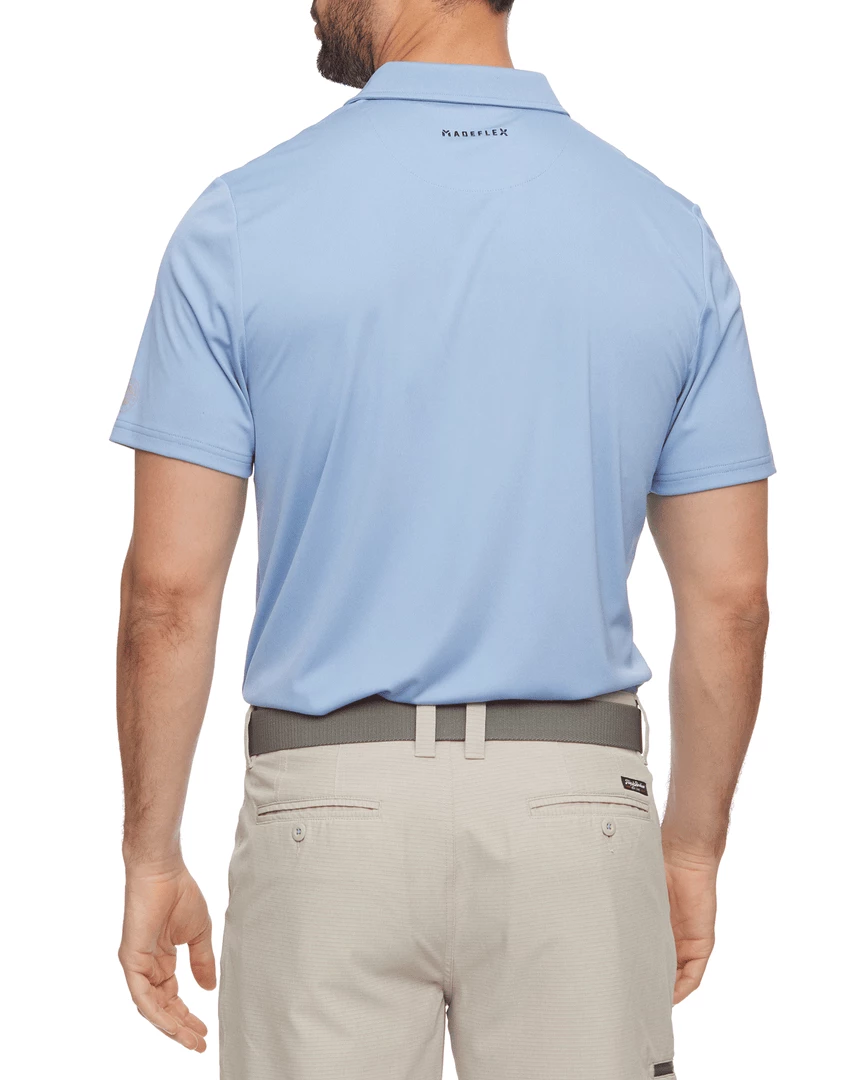 An innovative performance polo designed to look sharp, feel comfortable, and effortlessly transition from a morning on the water to an afternoon on the course and then out to dinner and drinks afterward. Featuring some of our best performance technologies to wick away moisture, maximize mobility, and shield you from the sun plus a versatile heathered look with micro-feeder stripes, this polo will quickly become your go-to. Traditional three-button front placket; rubberized MadeFlex performance patch logo at center back neck. Tailored athletic fit.