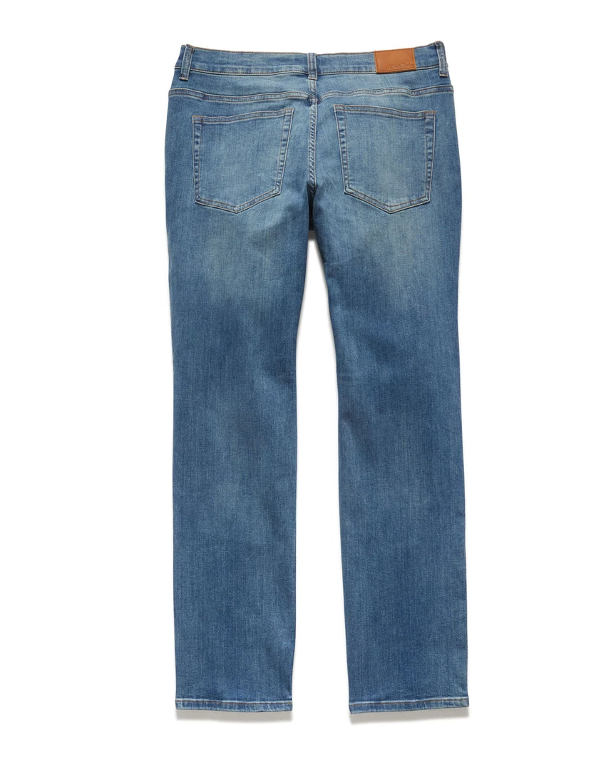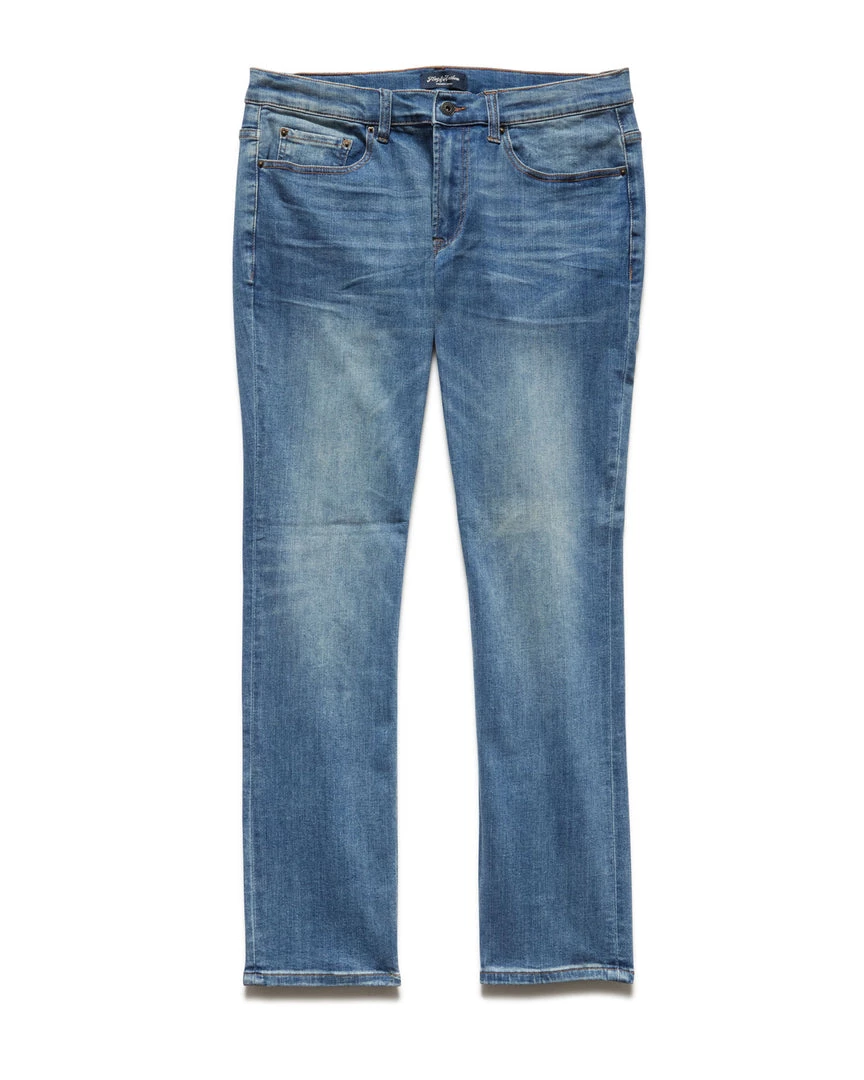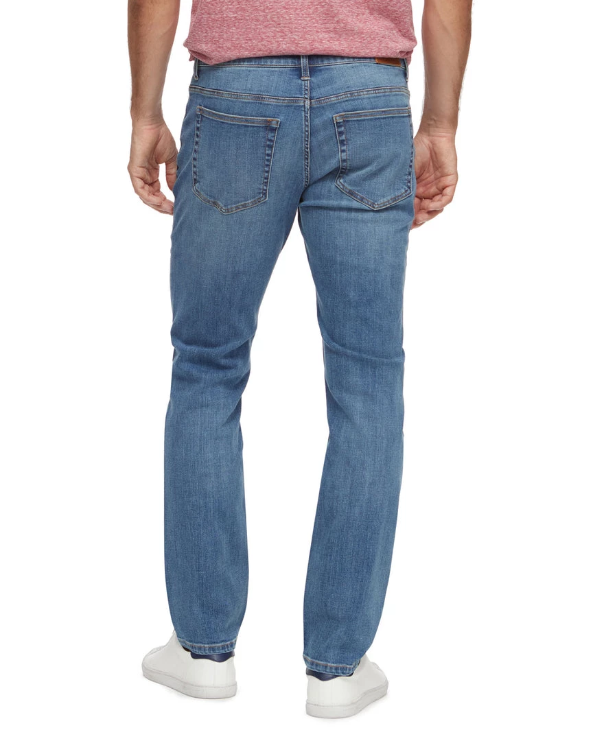 This slim-fit jean is infused with just the right amount of stretch and featured in an on-trend light wash for a comfortable and versatile look that’s easy to dress up or down. Traditional 5-pocket styling; zip-front fly with logo button closure. Leather logo back patch.Â