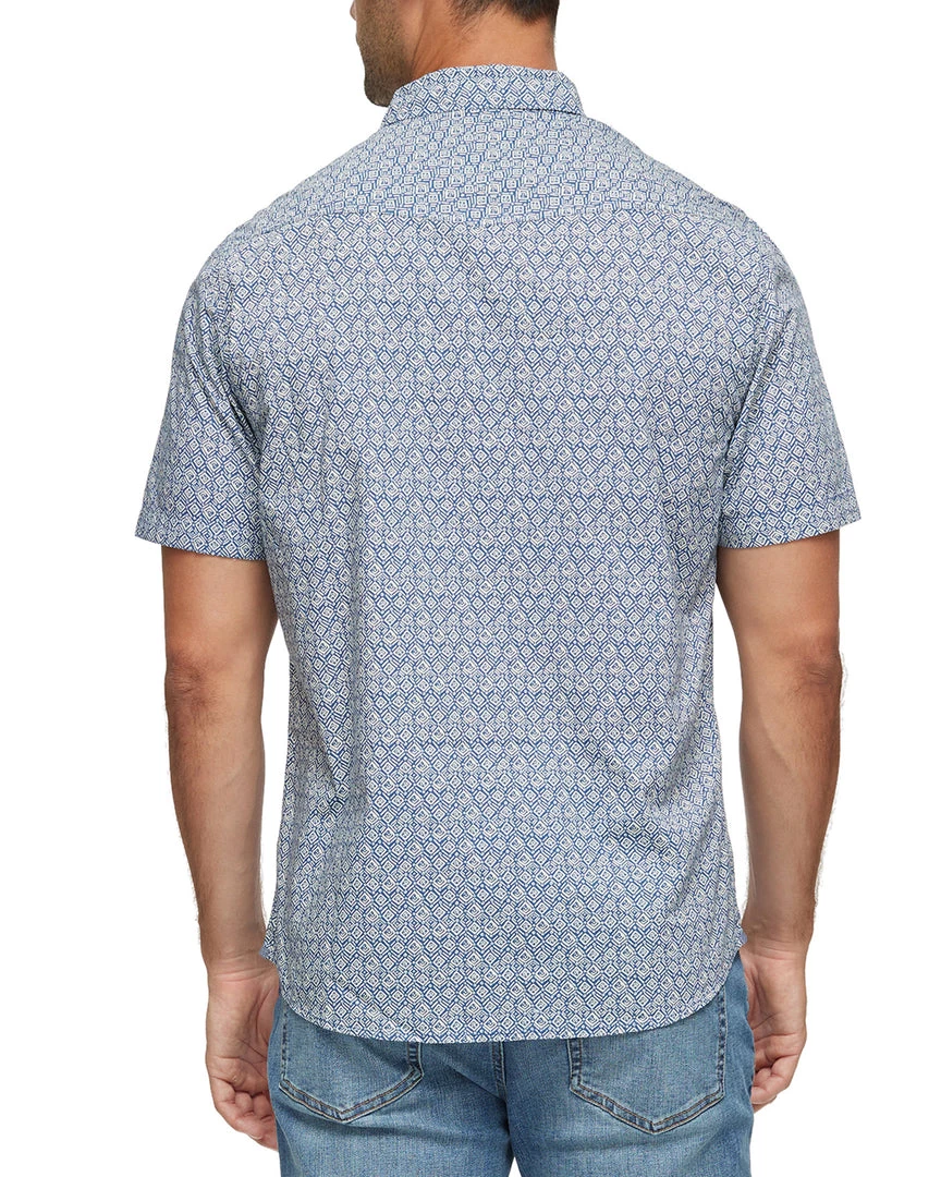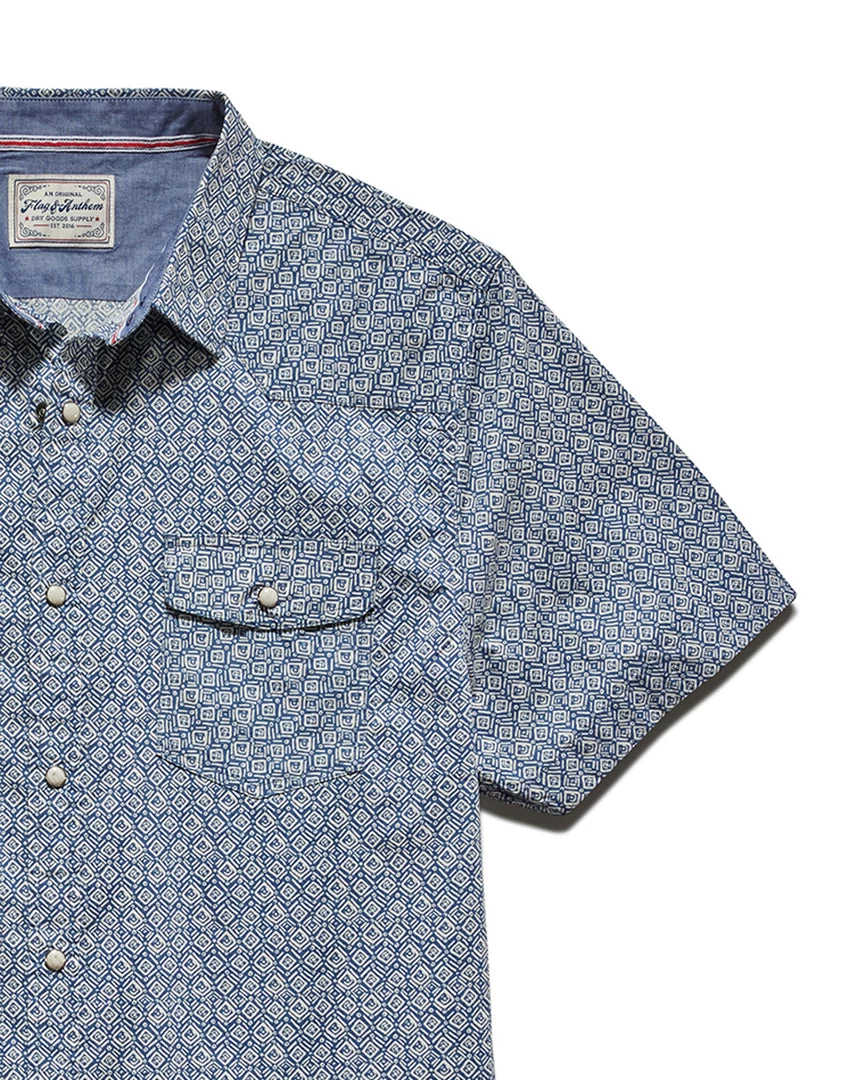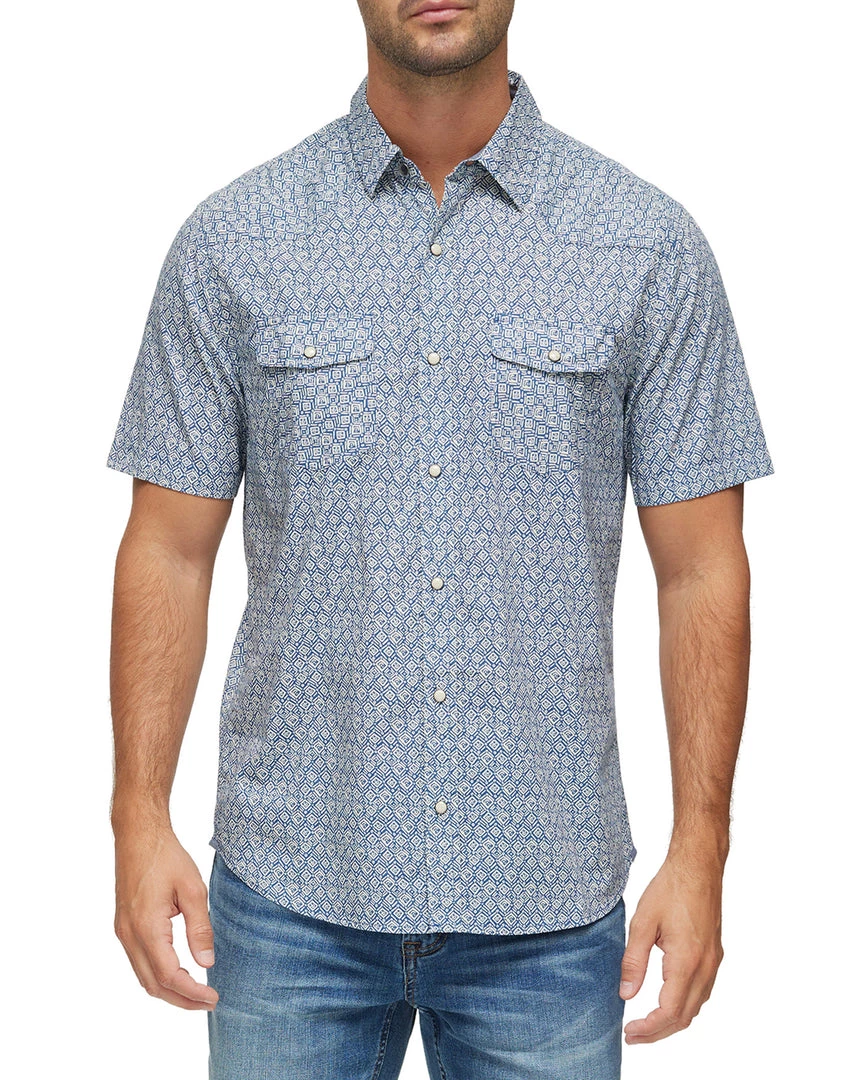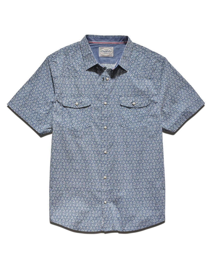 Comfortable and casual with an all-over geometric print, this premium cotton short sleeve shirt is the perfect pick for office days that lead right into happy hours. Featuring authentic, vintage-inspired, Western details and the perfect untucked length, you can dress it up or keep it casual over your favorite tee. Contrast chambray fabric inside collar stand, back yoke, and sleeve cuffs. Dual front chest pockets; button closures. Tailored athletic fit.