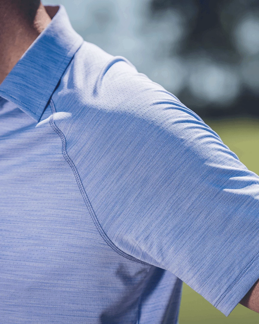 Made for the links but ready for anything, this performance polo is designed to keep you looking sharp and feeling comfortable on or off the beaten cart path. Constructed with tour-quality fabrics and outfitted with pro-level technologies to wick away moisture and sweat and maximize mobility, it will never get in the way of your golf swing. Heathered look with micro-feeder stripes. Traditional three-button front placket; raglan sleeves. Rubberized MadeFlex performance patch logo at center back neck. Tailored athletic fit.