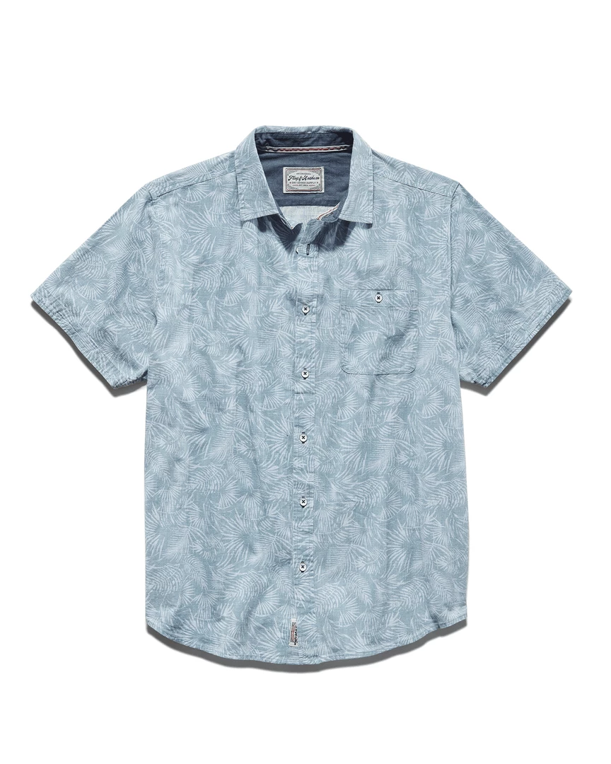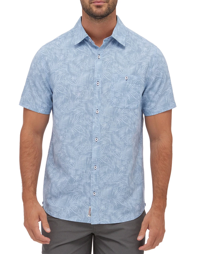 Bring some island vibes to your everyday look with this super-soft and comfortable palm-print shirt. Easy to wear with shorts, chinos, or jeans, this endlessly versatile short sleeve shirt is your new go-to for laidback summer days. Contrast fabric in collar and cuffs. Single front chest pocket; button closures. Tailored athletic fit.