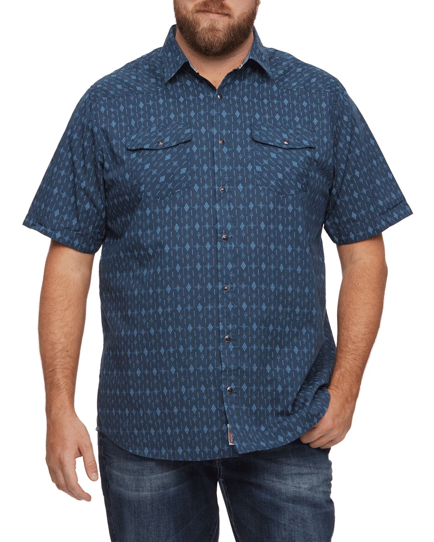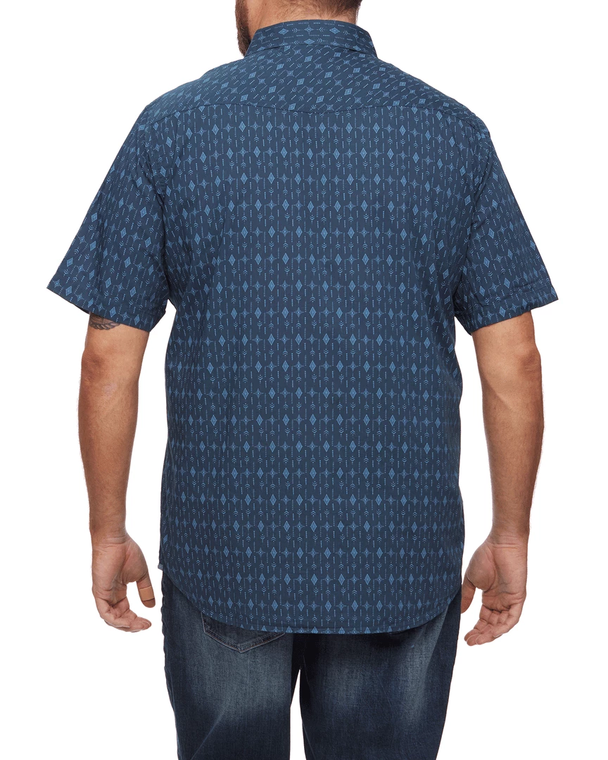 Comfortable and casual with an all-over Southwestern-inspired geometric print, this premium cotton short-sleeve shirt stands up to serious wear and looks good doing it. Contrast fabric inside collar stand, back yoke, front placket, and sleeve cuffs. Dual front chest pockets; pearlized snap closures.
